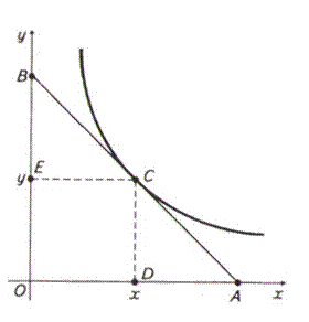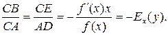 тобто еластичність можна подати у вигляді «логарифмічної» похідної. Як і похідна, еластичність має простий геометричний зміст: Оскільки y' = tg α, де α – кут нахилу дотичної, проведеної до графіка функції y = f (x) у точці x, то за означенням Знайдемо еластичність функції в довільній точці C (x; y). Для цього проведемо дотичну АВ до графіка функції y = f (x) у точці С. Нехай А і В – точки перетину дотичної з осями О x і О y відповідно. Розглянемо спадну опуклу вниз функцію y = f (x). (рис. 1)
