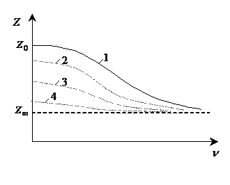 При послідовному сполученні R і C (мал. 4.37а) схема має суттєві розбіжності з дослідом при пропусканні постійного струму. Якщо w ® 0, то вона чинить нескінченно великий опір постійному струмові (Z 0 ® ¥), що не відповідає дійсності. Якщо ж С і R з’єднати паралельно (мал. 4.37б), то при високих частотах (w ® ¥) Z ¥ ® 0, що теж не відповідає дійсності. Для біологічних тканин характерне більш складне поєднання ємності й активного опору. Найбільш вдалими є схеми, що приведені на мал. 4.37в,г. При пропусканні через такі схеми високочастотного струму при w ® ¥, XC ® 0 їх імпеданс асимптотично наближається до деякої константи Z ¥ (у випадку в: Z ¥ = R 1× R 2/(R 1 + R 2), а у випадку г: Z ¥ = R 1 + R 2). Ці схеми з певним наближенням можуть бути еквівалентними електричними схемами біологічних тканин, але ні одна з них не може повністю відтворювати закономірності пропускання електричного струму через біологічні системи. На мал. 4.38 приведені графіки дисперсії (частотної залежності) імпедансу рослинної тканини: 1 – крива для нормальної здорової тканини; 2 – для нагрітої до t = 50°C протягом 2 хв; 3 – те ж саме протягом 4 хв; 4 – після кип’ятіння в воді протягом 20 хв.