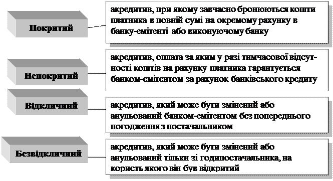 Рис. 4. Види акредитивуУ випадку відкриття акредитива, депонованого у виконуючому банку, банк-емітент перераховує кошти платника на аналітичний рахунок «Розрахунки акредитивами» у банку бенефіціара та повідомляє його про умови акредитива. У разі відкриття акредитива, депонованого у банку-емітенті, заявник перераховує дорученням кошти зі свого рахунка на аналітичний рахунок «Розрахунки акредитивами» (рис. 5).