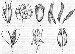 Мал. 4. Типи сухих плодів: 1 — сім'янка; 2 — багатогорішок; З — жолудь; 4 — біб; 5 — стручечок; 6 — багатолистянка; 7 — вислоплідник