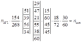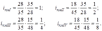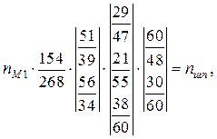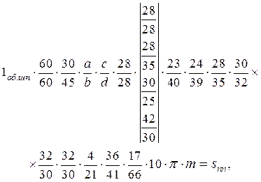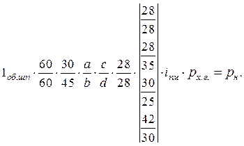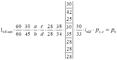 де a, b, c, d – числа зубців змінних коліс гітари; рх.г. – крок ходового гвинта; рн – крок різьби, що нарізається. При нарізанні метричних і модульних різьб вмикають муфти М3, М4, М5 при вимкненій муфті М2. Рух від шпинделя передається безпосередньо через передачу