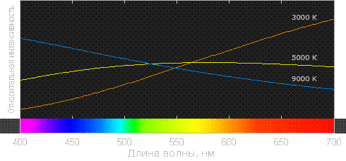 5000 K производит примерно нейтральный свет, тогда как 3000 K и 9000 K порождают свет, спектр которого смещён в оранжевую и синюю стороны, соответственно. При нарастании цветовой температуры распределение цвета становится более холодным. Это может показаться интуитивно непонятным, но следует из того факта, что более короткие длины волн несут свет более высокой энергии. Почему цветовая температура является полезным описанием света для фотографов, если они никогда не имеют дела с абсолютно чёрными телами? К счастью, такие источники света, как дневной свет или вольфрамовые лампы накаливания, создают спектры света, практически аналогичные светимостям абсолютно чёрных тел, хотя другие источники, такие как флюоресцентные или большинство продающихся энергосберегающих ламп, существенно от них отличаются. Поскольку фотографы никогда не используют термин «цветовая температура» применительно к настоящим абсолютно чёрным телам, этот термин подразумевает «коррелированную цветовую температуру», с соответствующей окраской источника света. Следующая таблица демонстрирует на пальцах коррелированную цветовую температуру некоторых распространённых источников света: