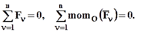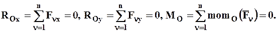 Для равновесия плоской системы сил, необходимо и достаточно, чтобы суммы проекций всех сил на оси x, y, лежащие в плоскости действия сил и алгебраическая сумма величин моментов всех сил относительно любой точки плоскости равнялись нулю.