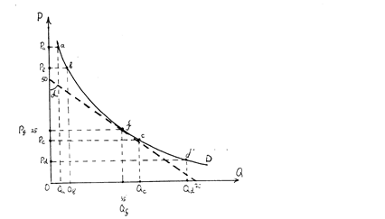 Именно этой формулой удобнее всего пользоваться при реальных вычислениях дуговой эластичности. Конечно, для этого необходимо знать числовые значения Q 1, Q 2 и P 1, P 2. Дуговая эластичность может рассчитываться и для случая линейной функции спроса для любых ее отрезков. 2. Точечный метод. Представим теперь, что нам нужно определить эластичность не на отрезках ab и cd, а в некоторой произвольно взятой точке f на кривой спроса (рис. 2.11). В этом случае можно воспользоваться формулой 2.9, но заменив D Q и D Р бесконечно малыми величинами. Тогда эластичность можно определить как: