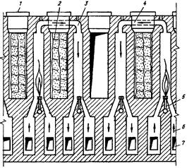 Рис. 27. Схема коксовой батареи 1 - люки для загрузки угольной шихты; 2 - коксовые камеры; 3 - обогревательные каналы простенков; 4 - переходные каналы; 5 - подача горючего газа; 6 - регенераторы для подогрева воздуха; 7 - борова для отвода продуктов сгорания Чугун получают путем восстановления железа из окислов руд в доменных (высоких) печах. Доменная печь является непрерывно работающим плавильным агрегатом шахтного типа. Сверху в нее загружают железорудные материалы, кокс и отводят образующиеся газы, а снизу через фурмы подают горячий воздух и через летки выпускают жидкие продукты плавки – чугун и шлак. Внутренний объем печи, ограниченный огнеупорной кирпичной кладкой (футеровкой) обычно называют полезным объемом. Наиболее крупные доменные печи имеют полезный объем более 5000 м3 и их производительность достигает 12000 т чугуна в сутки, т.е. ежеминутно выплавляется около 9 т чугуна. Полезная высота доменной печи достигает 35м. Доменная печь имеет стальной кожух, выложенный внутри огнеупорным шамотным кирпичом. Рабочее пространство печи (рис.28) включает колошник 6, шахту 5, распар 4, заплечики 3, горн 1, лещадь 15. В верхней части колошника находится засыпной аппарат 8, через который в печь загружают шихту (офлюсованный агломерат и окатыши). Шихту взвешивают, подают в вагонетки 9 подъемника, которые передвигаются по мосту 12 к засыпному аппарату 8 и, опрокидываясь, высыпают шихту в приемную воронку 7 распределителя шихты. При опускания малого конуса 10 засыпного аппарата шихта попадает в чашу 11, а при опускании большого конуса 13 - в доменную печь, что предотвращает выход газов из доменной печи в атмосферу. Для равномерного распределения шихты в доменной печи малый конус и приемная воронка после очередной загрузки поворачиваются на угол, кратный 60° (подробнее рис. 29). При работе печи шихтовые материалы, проплавляясь, опускаются, а через загрузочное устройство в печь подаются новые порции шихты в таком количестве, чтобы полезный объем печи был заполнен, объем печи - это объем, занимаемый шихтой от лещади до нижней кромки большого конуса засыпного аппарата приего опускании.