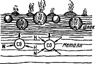 Рис. 32. Схема удаления газов из жидкого металла в процессе кипения В этот же период создаются условия для удаления серы из металла. Сера в стали находится в виде сульфида [FeS], который растворяется также в основном шлаке (FeS). Чем выше температура, тем большее количество FeS растворяется в шлаке, т.е. больше серы переходит из металла в шлак. Сульфид железа, растворенный в шлаке, взаимодействует с оксидом кальция, также растворенным в шлаке: (FeS) + (СаО) = (CaS) + (FeO). (7) Эта же реакция протекает на границе металл - шлак между сульфидом железа в стали [FeS] и (СаО) в шлаке: [FeS] + (СаО) = (CaS) + (FeO). (8) Образующееся соединение (CaS) растворимо в шлаке, но не растворяется в железе, поэтому сера удаляется в шлак. Третий этап (завершающий) - раскисление стали - заключается в восстановлении оксида железа, растворенного в жидком металле. При плавке повышение содержания кислорода в металле необходимо для окисления примесей, но в готовой стали кислород - вредная примесь, так как понижает механические свойства стали, особенно при высоких температурах. Легирование стали осуществляют введением ферросплавов или чистых металлов в необходимом количестве в расплав. Легирующие элементы (Ni, Co, Мо, Си), сродство к кислороду у которых меньше, чем у железа, при плавке и разливке практически не окисляются, и поэтому их вводят в печь в любое время плавки (обычно вместе с остальной шихтой). Легирующие элементы, у которых сродство к кислороду больше, чем у железа (Si, Mn, Al, Cr, V, Ti и др.), вводят в металл после раскисления или одновременно с ним в конце плавки, а иногда непосредственно в ковш.