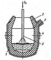 Рис. 34. Устройство кислородного конвертера 1 – водоохлаждаемая кислородная фурма; 2 – корпус; 3 – опорный пояс с цапфами; 4 – механизм провода