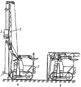 Универсальным базовым оборудованием для перемещения свай с мест их раскладки к местам погружения, их установки, поддержания и направления, а также для крепления погружателя являются копры, обеспечивающие также передвижение сваебойного оборудования вдоль фронта работ. Копрами, кроме того, погружают сваи-оболочки кольцевого сечения диаметром от 0,5 до 2,5 м длиной до 30 м, состоящие из звеньев длиной 3...8 м, а также металлический шпунт специального корытного или Z‑образного профиля длиной до 25 м. Различают копры рельсовые (КР) и навесные (КН) на тракторах, одноковшовых экскаваторах и автомобилях. Применяют также навесное копровое оборудование (КО) на гусеничных тракторах, экскаваторах и кранах, реже - на автомобильных (пневмоколесных) кранах. Для забивки свай и шпунта в воде используют плавучие копры. Навесные копры и копровое оборудование используют преимущественно в жилищном и промышленном строительстве, а рельсовые копры - в гидротехническом и энергетическом строительстве. Главным параметром отечественных копров, входящих в их индекс, является максимальная длина погружаемых свай (до 8, 12, 16, 20 и 25 м). Так, например, индекс КН-12 расшифровывают как копер навесной для свай длиной до 12 м; КР-16 - копер рельсовый для свай длиной до 16 м и т.д. По степени подвижности рабочего оборудования различают копры универсальные, полууниверсальные и простые. Универсальные копры обеспечивают полный поворот платформы с установленным на ней оборудованием, изменение вылета и наклон копровой стрелы для погружения наклонных свай. Полууниверсальные копры обеспечивают либо только поворот платформы для погружения вертикальных свай, либо наклон стрелы при работе с наклонными сваями. Простые копры, к которым относится обычно копровое оборудование, не имеют механизмов для поворотных (в плане) движений и наклона стрелы. Рабочий процесс копра состоит из его перемещения к месту установки сваи, ее строповки, подтягивания, установки на точку погружения по предварительно выполненной разметке, выверки правильности ее положения, закрепления на свае наголовника, предохраняющего ее от разрушения при ударном погружении, установку на сваю погружателя, расстроповку сваи, ее погружение с последующей выверкой направления, подъем погружателя и снятие с погруженной сваи наголовника. Навесные копры являются наиболее распространенным типом машин для производства свайных работ. Они могут быть универсальными и полууниверсальными. В качестве базовых машин используют тракторы, одноковшовые экскаваторы и автомобили. Каждую модель навесного копра комплектуют свайными молотами соответствующих типоразмеров. Для начала работы на новой строительной площадке навесной копер подготавливают к функционированию в соответствии с инструкцией по эксплуатации, затем с помощью автомобильного крана навешивают на стрелу в ее нижней части свайный молот и закрепляют на нем канат копрового агрегата. Копры на тракторной базе применяют для работы со сваями длиной от 8 до 12 м при их линейном или кустовом расположении. Копровую стрелу 2 обычно навешивают на базовый трактор 3 в его задней части (рис.155, а). Ее наклон в продольной вертикальной плоскости на угол от 10 до 33° и в поперечной