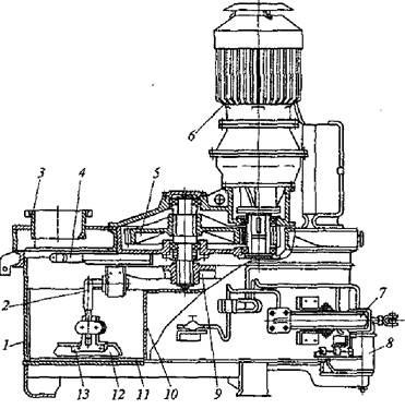 Эти машины особенно рекомендуется применять для приготовления жестких смесей. В роторный смеситель (рис.168) сухие компоненты подают через загрузочный патрубок 3, а воду - по кольцевой перфорированной трубе 4. Смесь перемешивается лопастями 12, установленными на державках 13 кронштейнов 2, в кольцевом пространстве, ограниченном внешней обечайкой 7 смесительной чаши и внутренним стаканом 10, футерованными сменными износостойкими плитами 11. Несколько таких кронштейнов закреплены на траверсе 9, вращение которой передается от электродвигателя 6 через редуктор 5. Разгружают готовую смесь через секторный затвор 8, управляемый пневмоцилиндром 7. Цикличные смесители с горизонтальным лопастным валом и турбулентные смесители применяют для приготовления строительных растворов.