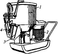 В смесителях первого типа (рис.169) смесь перемешивается двумя винтовыми лопастями 3, установленными на валу 4, приводимом в движение от электродвигателя 2 через ременную передачу 1 и редуктор 5. Разгружают готовую смесь через затвор 6, управляемый пневмоцилиндром 7. В турбулентный растворосмеситель (рис.170) компоненты загружают через горловину в верхней части корпуса 1. При вращении лопастного ротора, приводимого в движение электродвигателем 2, перемешиваемые материалы совершают многократные перемещения в конической периферии корпуса, поднимаясь вверх по ней и оседая в центральной части. Разгружают готовый раствор через люк 3 при открытом затворе 4. Производительность смесителей цикличного действия П = VzkВkИ, где П - производительность смесителей цикличного действия, м3/ч; V — вместимость смесителя по загрузке, м3; z — число замесов в час; kВ — коэффициент выхода смеси (kВ = 0,75...0,85); kИ ‑ коэффициент использования смесителя во времени.