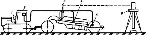 Скреперы нашли широкое применение на послойной разработке грунта и точной планировке под заданные отметки крупных строительных площадок и дорог. Для этого прицепные гидроуправляемые скреперы оборудованы автоматической аппаратурой, обеспечивающей автоматическое управление положением ковша по высоте, перемещением задней стенки и выглублением ковша при перегрузке для предотвращения отключения силовой установки. Использование автоматизированных скреперов позволяет повысить: производительность труда за счет сокращения числа проходов; качество выполняемых работ; улучшить условия работы машиниста. Для точной планировки под заданные отметки и получения различных уклонов земляной поверхности используют аппаратуру «Копир-Стабилоплан-10Л» (рис.206) с лазерным устройством. В состав аппаратуры входят электрогидрораспределитель 1, пульт с блоком управления 2, механизм перемещения 3 с ФПУ,