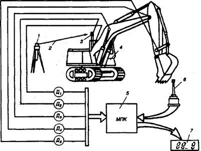 устанавливается на дне траншеи в начале ее разработки с направлением пучка лазера вдоль оси траншеи с проектным углом наклона. В кабине машиниста располагается информационно - индикаторное устройство, на экране которого он по положению (перемещению) лазерного пятна определяет величину и направление отклонения ковша от заданных отметок и устанавливает ковш в требуемое положение. Другая автономно-копирная система управления одноковшовым экскаватором 4 (рис.209) по лучу лазера 2 состоит из лазерного излучателя 1, информационно-измерительного устройства с датчиками Д1...Д5, установленными в шарнирах крепления рабочего оборудования, и механизмом перемещения фотоприемного устройства 3, а также микропроцессорного устройства 6, анализующего заданный закон управления рабочим процессом машины. Во время работы микропроцессорное устройство по сигналам датчиков вырабатывает управляющие сигналы, поступающие на исполнительные устройства, т.е. на гидроцилиндры положения стрелы, рукоятки ковша для поддержания заданной глубины копания и требуемого угла резания. Управление работой машины осуществляется рукояткой 6, а рабочие параметры высвечиваются на дисплее 7. При этой системе копание производится вручную по индикатору глубины копания, а на зачистных операциях включается автоматическая система управления, обеспечивающая заданную глубину копания, прямолинейность траектории движения режущей кромки ковша и заданный угол резания. Наибольшую эффективность использования экскаваторов с лазерными системами дает применение бортовых микрокомпьютеров. В этом случае в память компьютера вносятся все необходимые
