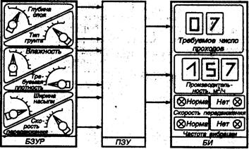 Незаменимыми машинами для уплотнения дорожно-строительных материалов при строительстве дорог и различных площадок являются дорожные катки, автоматизации которых в последнее время уделяется большое внимание. Современные дорожные катки с гидравлической системой управления для автоматической настройки на оптимальный режим работы оснащаются электронной системой с микропроцессорной техникой. Применение бортового микропроцессора позволяет, в зависимости от требуемой плотности и толщины укатываемого слоя, выбирать и автоматически поддерживать постоянную скорость передвижения катка, а ее изменение производить плавно, равномерно и качественно уплотняя материал. Эта система обеспечивает не только соответствие направления движения машины вращению вала вибровозбудителя, но и автоматический разгон и торможение, а также изменение частоты колебаний в зависимости от плотности укатываемой поверхности, включение и отключение вибровозбудителя при изменении направления движения катка. Система электронного автоматического управления вибрационным катком состоит из силовой (гидравлической) части и электронного блока управления ЭБУ с операционным усилителем. Силовая часть содержит регулируемые реверсивные аксиально-поршневые насосы, аксиально-поршневые регулируемые и нерегулируемые гидромоторы, насосы систем управления и подпитки, а также редукционные клапаны с пропорциональным электрическим управлением. Величина электрического сигнала из ЭВУ обеспечивается пропорциональным регулированием насосов ходовой системы и вибровозбудителя. В этом случае задающий сигнал от рычага подачи топлива подается в ЭБУ, усиливается, преобразуется в нем и поступает на управляющие обмотки пропорционального электромагнита редукционного клапана, формирующего требуемое давление в системе управления. При этом поток рабочей жидкости перемещает поршень гидроусилителя насоса и, изменяя угол наклона блока цилиндров, определяет подачу насоса в соответствии с заданным сигналом. Регулирование подачи насоса в зависимости от нагрузки производится следующим образом. Увеличение нагрузки на движителях вызывает увеличение крутящего момента на валу двигателя, что определяется датчиком скорости. Датчик обратной связи регистрирует снижение частоты вращения вала двигателя и подает сигнал в ЭБУ, из которого сигнал рассогласования поступает в редукционный клапан, формирующий давление в системе управления в соответствии с величиной поступившего сигнала. В связи с этим уменьшается и подача насоса. При отключении одного из мостов катка в ЭБУ формируется сигнал, подаваемый на пропорциональные электромагниты редукционных клапанов. В результате этого подача насоса уменьшается в два раза, а заданная скорость движения катка сохраняется постоянной. Вибровозбудитель приводится в работу с помощью объемного гидропривода. При этом для предотвращения образования наплывов грунта и в особенности асфальта при изменении направления движения или при остановке катка происходит автоматическое отключение вибровозбудителей (в связи с уменьшением скорости катка ниже допустимой), а при достижении заданной скорости они вновь включаются в работу. В системе автоматики используются переключатели выбора частоты вибрации и отключения одного из вибровозб