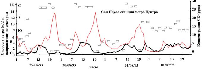 На рисунке 1 приведен типичный ход концентраций СО в центре десятимиллионного Сан Пауло (25 ю.ш.) в начале южной весны по данным Компании по технологиям очистки окружающей среды, Lacava et all, 1994. Вечерние пики в 20-21 часа связаны с медленным потоком автомобилей из делового центра после закрытия большинства учреждений, магазинов и т.д. или возвратом в из-за города в воскресные дни (29 августа). Утренние пики концентраций (8-9 часов) выражены более слабо. Дневной спад концентраций наблюдается обычно в 12-14 часов в обеденное время и усилением ветра. Максимальные пики СО до 25,3 ррm в 22 часа в воскресенье определяются двумя причинами установление штиля (calmaria) или затишье с слабым ветром <0,6 м/c сопровождалось по данным утренних радиозондирований, термическими инверсиями с нижней и верхней границей на 140 м и 330-430 метрах с другой. Такие условия характерны в данном случае установлению гребня высокого давления над южной Атлантикой. Приход холодного фронта с юга ночью 31 августа способствовал усилению ветра южных направлений и рассеянию примесей. Отметим, что максимальная за 1993 концентрация наблюдалась, через неделю и достигла 33,5 ррm.