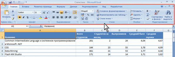 Лента Общая информация Работа в Microsoft Excel 2007 1. Лекция: Интерфейс Microsoft Excel 2007: Лекция знакомит пользователя с интерфейсом Microsoft Excel 2007. Представлены основные элементы нового интерфейса. Особое внимание обращено на ленту. Показаны возможность скрытия и отображения ленты, особенности отображения ленты при различных размерах окна Microsoft Excel 2007. Перечислены вкладки окна Microsoft Excel 2007, приведены ситуации отображения контекстных вкладок, обращено внимание на возможность отображения дополнительных вкладок. Описаны способы работы с элементами управления: кнопками, списками и др. Показаны возможности настройки панели быстрого доступа. Представлен новый элемент окна - мини-панель инструментов При планировании выпуска системы 2007 Microsoft Office разработчиками была поставлена задача сделать основные приложения Microsoft Office удобнее в работе. В результате был создан пользовательский интерфейс Microsoft Office Fluent, который упрощает для пользователей работу с приложениями Microsoft Office и дает им возможность более быстро получить лучшие результаты. В предыдущих выпусках приложений Microsoft Office для выполнения своей работы пользователи использовали систему меню, панелей инструментов, диалоговых окон. Эта система работала хорошо, когда в приложениях было ограниченное число команд. Теперь, когда программы выполняют намного больше функций, система меню и панелей инструментов работает не так хорошо. Слишком много программных возможностей многим пользователям трудно найти. Целью переработки дизайна пользовательского интерфейса Office Fluent было упрощение для пользователей процедур поиска и использования всего диапазона возможностей, предоставляемых этими приложениями. Кроме того, предполагалось предотвратить загромождение рабочей области и, следовательно, отвлечение внимания пользователей для того, чтобы они могли больше времени и энергии тратить на свою работу. Главный элемент пользовательского интерфейса Microsoft Excel 2007 представляет собой ленту, которая идет вдоль верхней части окна каждого приложения, вместо традиционных меню и панелей инструментов. (рис. 1.1).