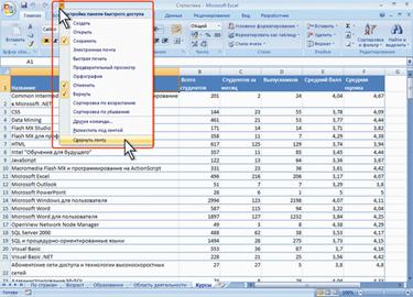 С помощью ленты можно быстро находить необходимые команды (элементы управления: кнопки, раскрывающиеся списки, счетчики, флажки и т.п.). Команды упорядочены в логические группы, собранные на вкладках. Заменить ленту панелями инструментов или меню предыдущих версий приложения Microsoft Excel нельзя. Удалить ленту также нельзя. Однако чтобы увеличить рабочую область, ленту можно скрыть (свернуть). 1. Нажмите кнопку Настройка панели быстрого доступа (рис. 1.2). 2. В меню выберите команду Свернуть ленту.
