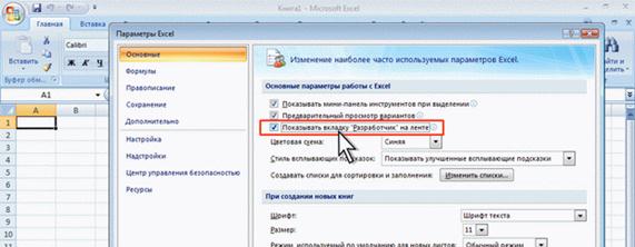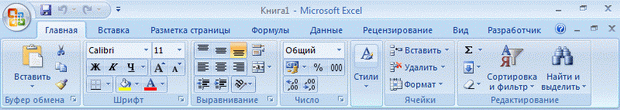 Рис. 1.8. Скрытие ленты и вкладок при уменьшении ширины окна По умолчанию в окне отображается семь постоянных вкладок: Главная, Вставка, Разметка страницы, Формулы, Данные, Рецензирование, Вид. Для перехода к нужной вкладке достаточно щелкнуть по ее названию (имени). Каждая вкладка связана с видом выполняемого действия. Например, вкладка Главная, которая открывается по умолчанию после запуска, содержит элементы, которые могут понадобиться на начальном этапе работы, когда необходимо набрать, отредактировать и отформатировать текст. Вкладка Разметка страницы предназначена для установки параметров страниц документов. Вкладка Вставка предназначена для вставки в документы различных объектов. И так далее. Кроме того, можно отобразить еще одну вкладку: Разработчик. 1. Щелкните по кнопке Microsoft Office 2. Выберите команду Параметры Excel. 3. Во вкладке Основные диалогового окна Параметры Excel установите соответствующий флажок (рис. 1.9).