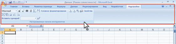 На вкладке Разработчик собраны средства создания макросов и форм, а также функции для работы с XML. Файлы и шаблоны предыдущих версий Excel могли содержать пользовательские панели инструментов. В этом случае при открытии таких файлов в Excel 2007 появляется еще одна постоянная вкладка – Надстройки (рис. 1.10).