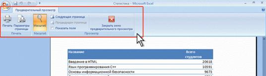Эта вкладка содержит элементы панелей инструментов, созданных в предыдущих версиях Excel. Каждая панель инструментов занимает отдельную строку ленты вкладки. Однако некоторые элементы, бывшие на панелях инструментов, в Excel 2007 могут отсутствовать. Стандартный набор вкладок заменяется при переходе из режима создания документа в другой режим, например, Предварительный просмотр (рис. 1.11).