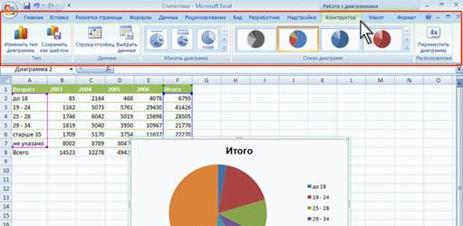 В некоторых случаях появляется сразу несколько вкладок, например, при работе с диаграммами появляются три вкладки: Конструктор, Макет и Формат (рис. 1.13).