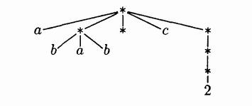В свою очередь, лес можно рассматривать как особую структуру списка. Слово "Список" здесь применяется в очень специфическом смысле, и, чтобы подчеркнуть это, его пишут с прописной буквы. Рекурсивно Список определяется как конечная последовательность атомов или Списков, число которых может быть больше или равно нулю. здесь под словом "атом" подразумевается неопределенное понятие, которое может относиться к элементам любой совокупности объектов и которое можно отличить от Списка.С помощью обычной системы обозначений на основе запятых и скобок можно различать атомы и списки, а так же быстро и просто указывать упорядочение в пределах Списка. Рассмотрим список с 5 элементами L=(a,(b,a,b),(),c,(((2)))), в котором, сначала следует атом a, затем список (b,a,b), после, пустой Список (), атом с, и, наконец, Список(2). Последний Список состоит из списка ((2)), который включает список (2), который, в свою очередь, включает атом 2. Этому списку соответствует древовидная структура:
