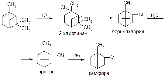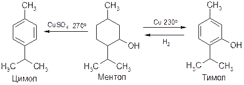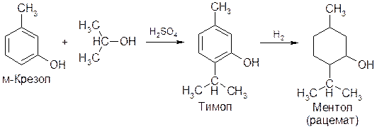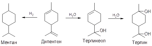 При гидрировании дипентена образуется ментан (доказательство строения дипентена). Последовательная гидратация дипентена дает терпинеол (α) и терпин. α-Терпинеол – жидкость с запахом сирени, содержится в скипидаре и эфирных маслах. Терпинеолы (смесь изомеров) в виде ацетата применяются для составления парфюмерных композиций, обладают антибактериальными свойствами. Терпин в виде гидрата применяется как отхаркивающее средство при бронхите. При дегидратации терпина в разбавленной кислоте образуется цинеол (эвкалиптол):
