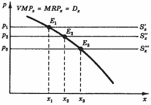 Кривая VMРx MRРx на рис. 2 имеет отрицательный наклон, потому что c увеличением применения переменного ресурса MРx уменьшаетcя, а цена продукта P остается прежней (фирма - со вершенный конкурент на рынке продукта). Для фирмы цена ресурса задана из вне и постоянна, т. е. кривая предложения ресурса Sx является горизонтальной линией: объем спроса фирмы на ресурс X настолько мал по сравнению с рыночным объемом спроса, что фирма не может по влиять на цену ресурса (фирма - совершенный конкурент на рынке ресурса).