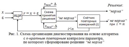 Рассмотрим функциональный контроль системы при введении временной избыточности на основе алгоритма с n-кратным повторным контролем параметров, по которым было сформировано решение “ не норма ” после (n – 1)-измерения. Схема организации допускового контроля на основе данного алгоритмом приведена рис. 1 и заключается в следующем.