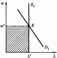 Предположим, что все факторы однородны, рынки конкурентны, барьеры на вход/выход из отрасли минимальны и рынки пришли в некое равновесное состояние. Рассмотрим отдельно взятый рынок какого-нибудь фактора, например труда (аналогично мы можем рассматривать и любой другой факторный рынок) (рис. 1). Предположим также для простоты, что эластичность предложения труда равна нулю (в случае ненулевой эластичности логика наших рассуждений не изменится).