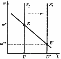 При прочих равных условиях понижение рыночной цены труда будет увеличивать спрос на него, ибо фирмы будут заинтересованы в использовании трудоемких технологий в противовес капиталоемким. Повышение же уровня зарплаты, наоборот, будет побуждать фирмы сокращать рабочие места и увеличивать долю капитала в создании национального дохода. Мы предполагали предложение труда неизменным. Рассмотрим же теперь случай, когда кривая предложения сдвигается ceteris paribus. Например, в случае усиления иммиграции в страну или через 18-20 лет после всплеска рождаемости внутри данной страны предложение рабочей силы возрастает. То есть кривая (прямая) предложения сдвигается вправо (рис. 2) в положение S'L.