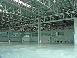 Рис.3Монтажные ворота. МВЦ Крокус Экспо. · Цвет В выставочных залах для торгово-промышленных выставок преобладает нейтральная цветовая гамма. Это объясняется тем, что акцент при проведении выставки делается на стенды и стены, пол, потолок не должны этому мешать. Иногда стены, потолок, да и пол в которых случаях может стать полем, на которое вешают рекламный носитель, указатель или наносят рекламное изображение. Специальные залы, как правило, выполнены в нейтральной цветовой гамме. В отделке стен используются светлые оттенки серого, бежевого. Пол залов тоже светлый, иногда бывает чуть темнее. Здесь используются примерно те же оттенки серого, охристого. Потолок обычно усеян огромным количеством балок, осветительных приборов, поэтому точный цвет оттенок назвать нельзя. Обычно это серый, цвет стали.