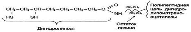 · Стадия П. Дигидролипоилтрансацетилаза (Е2) катализирует перенос атома водорода и ацетильной группы от ТДФ на окисленную форму липоиллизиновых групп с образованием ацетилтиоэфира липоевой кислоты. Стадия III. На стадии III КоА взаимодействует с ацетильным производным Е2, в результате чего образуются ацетил-КоА и полностью восстановленный липоильный остаток, простетическая группа Е2. · Стадия IV. На стадии IV дигидролипоилдегидрогеназа (Е3) катализирует перенос атомов водорода от восстановленных липоильных групп на FAD - простетическую группу фермента Е3.