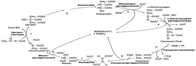 В составе дигидролипоилтрансацетилазы липоевая кислота связана с белком через остаток лизина амидной связью. Липоевая кислота играет роль витамина или фактора роста у некоторых микроорганизмов, тогда как высшие животные способны её синтезировать. · Стадия V. На стадии V восстановленный FADH2 передаёт водород на NAD+ с образованием NADH. Пируватдегидрогеназный комплекс характеризуется большим отрицательным окислительно-восстановительным потенциалом, который обеспечивает наряду с восстановлением кофермента (NADH) образование высокоэнергетической тиоэфирной связи в ацетил-КоА. Структурное объединение 3 видов ферментов создаёт возможности для координации отдельных этапов сложной ферментативной реакции. Все промежуточные продукты реакции окислительного декарбоксилирования пирувата прочно связаны с комплексом, что увеличивает суммарную скорость процесса и сводит к минимуму побочные реакции. Окислительное декарбоксилирование пирувата сопровождается образованием NADH, поставляющим электроны в дыхательную цепь и обеспечивающим синтез 3 молей АТФ на 1 моль пирувата путём окислительного фосфорилирования. Так как отношения ДДФ/АТФ и NADH/NAD+ в клетке относительно постоянны, ускорение утилизации АТФ приводит к повышению концентрации АДФ и ускорению окисления NADH в дыхательной цепи. Повышение концентрации NAD+, в свою очередь, стимулирует окислительное декарбоксилирование пирувата. Напротив, повышение концентрации АТФ и NADH снижает скорость этого процесса. Таким образом, изменения отношений АДФ/АТФ и NADH/ NAD+ - важнейшие сигналы, отражающие энергетические потребности клетки и регулирующие скорость окислительного декарбоксилирования пирувата. Цикл лимонной кислоты Цикл лимонной кислоты (цитратный цикл, цикл Кребса, цикл трикарбоновых кислот, ЦТК) - заключительный этап катаболизма. Это совокупность 8 последовательных реакций, в ходе которых происходят распад ацетил-КоА на 2 молекулы СО2 и образование доноров водорода для ЦПЭ NADН и FADН2.
