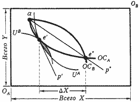 Возьмем знакомую нам экономику обмена при наличии цен. По-прежнему в ней два блага (X и Y), два индивида (А и В). Пусть А - покупатель товара Х, а В - продавец. Как известно, в соответствии с первой теоремой экономики благосостояния, конкурентные цены обеспечивают рыночное равновесие, которое является парето-эффективным. Это означает, что оно устанавливается на контрактной кривой в точке пересечения (точка е* на рис. 1) кривых предложения (offer curves) ОСA и ОСB. Бюджетная линия αр* показывает соотношение конкурентных равновесных цен (P*X/Р*Y). Теперь предположим, что индивид В стал монополистом. В результате он уже не пассивный ценополучатель, который руководствуется в своих действиях заданной рынком ценой, а напротив, он формирует цену на товар Х таким образом, чтобы максимизировать свое благополучие.