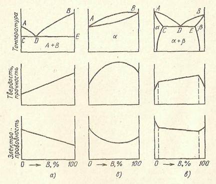 Рис. 1.11. Основные типы диаграмм состояния (верхний ряд) и характер изменения свойств в зависимости от концентрации В 1. Диаграмма состояний сплавов — механических смесей — изображена на рис. 1.11, а. Это случай, когда компоненты А и В взаимно растворяются только в жидком состоянии, а в твердом не растворяются и не вступают в химическое взаимодействие. В твердом состоянии (ниже линии CDE) все сплавы этой системы состоят из зерен чистых компонентов А + В. Свойства сплавов в данном случае зависят от свойств компонентов и их относительных количеств в каждом сплаве и изменяются по линейному закону от компонентов А и В. 2. При неограниченной взаимной растворимости компонентов в твердом состоянии получается диаграмма состояний, изображенная на рис. 1.11, б. В данном случае образуется непрерывный ряд сплавов — твердых растворов а переменной концентрации. Известно, что при растворении в кристаллической решетке одного компонента атомов другого она искажается и в ней возникают внутренние напряжения, тем больше, чем больше в решетке посторонних («чужих») атомов. Все это затрудняет передвижение дислокаций в зернах во время пластической деформации и повышает прочность сплава. В связи с отмеченным свойства сплавов неограниченных твёрдых растворов изменяются по криволинейному закону. 3. Показанная на рис. 1.11, в диаграмма состояний отражает поведение сплавляемых компонентов при ограниченной растворимости. В данном случае в твердом состоянии (ниже линии ACDEB) наблюдаются три структурно-фазовые области: области ограниченных α (слева) и β(справа) растворов и между ними область механических смесей этих растворов (α+ β). В областях, занятых только одним раствором, свойства изменяются по криволинейным законам, а в смешанной области — по линейному.