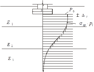 Расчет осадки выполняется графоаналитически. Порядок расчёта сводится к следующему: 1) Вычерчивается геологический разрез и в том же масштабе наносится разрез фундамента. 2) Толща грунта ниже подошвы фундамента разбивается на отдельные слои на глубину, равную трёхкратной ширине фундамента. Толщина элементарных слоёв назначается в пределах D i = (0,2 ¸ 0,4) b. 3) Для вертикали, проходящей через центр подошвы фундамента, вычисляют и строят эпюру природного давления. 4) Вычисляют и строят эпюру дополнительных давлений где 5) Определяют нижнюю границу сжимаемой толщи исходя из условия 6) В пределах каждого слоя определяют осадку от среднего значения дополнительных давлений в этом слое
