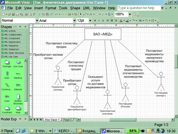 Азработка моделей бизнес-процессов предприятия оптовой торговли лекарственными препаратами Внешняя статистика продаж - статистика по продажам, получаемая из сети аптек; Внутренняя статистика продаж - статистика по продажам, получаемая из отчетов продаж клиентам компании; Номенклатурная единица - наименование медикамента, завода-изготовителя; ABC - классификация товара по выручке от продаж клиентам; XYZ - классификация товара по рейтингу популярности; Учетная цена - цена товара у поставщика с учетом скидок; Действующие контракты - контракты, по которым имеются обязательства сторон на определенный период времени; График поставок - очередность обращения к поставщикам, необходимая для поддержания деловых отношений; Страховой запас - минимальный запас товара, необходимый для покрытия потребностей до момента поставки новой партии товара. Разработка информационных систем включает в себя несколько этапов. Однако всегда начальным этапом создания системы является изучение, анализ и моделирование деятельности заказчика. Для того чтобы описать взаимодействие компании на верхнем уровне с внешними контрагентами, составляется физическая диаграмма. Для составления физической диаграммы в ходе первого интервью необходимо выяснить, кто является внешними контрагентами и какие у них основные функции. Задание 1. Формирование физической диаграммы Составьте физическую диаграмму в соответствии с описанием деятельности компании дистрибьютора МЕД. Компания дистрибьютор "МЕД" закупает медицинские препараты отечественных и зарубежных производителей и реализует их через собственную дистрибьюторскую сеть и сеть аптек. Планирование закупок компания осуществляет на основании статистики продаж, которую предоставляют сеть аптек и дистрибьюторы. Компания осуществляет доставку медикаментов как собственным транспортом, так и с помощью услуг сторонних организаций. Компания имеет собственный склад для хранения медикаментов. Выполнение задания 1 Компания осуществляет закупки у отечественных и зарубежных производителей, следовательно, контрагентами компании являются отечественные и зарубежные поставщики медикаментов. Компания пользуется услугами транспортных компаний для доставки медикаментов. Следовательно, транспортные компании являются внешними контрагентами. Кроме того, компания реализует медикаменты через дистрибьюторскую сеть и сеть аптек. Следовательно, контрагентами компании являются покупатели (дистрибьюторы, аптеки). Таким образом, внешними контрагентами компании "МЕД" являются поставщики (отечественные, зарубежные), покупатели (дистрибьюторы, аптеки), транспортные компании. На физической диаграмме компания изображается прямоугольником, для отображения контрагентов используются графический символ Actor (фигурка человечка). Для изображения связей между компанией и контрагентами используются линии (Communications). Взаимодействия компании и внешних контрагентов должны быть поименованы, чтобы были понятны функции контрагентов по отношению к компании при знакомстве с физической диаграммой. Создание физической диаграммы в MS Visio: