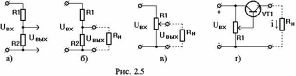 В качестве делителя можно использовать потенциометры, в которых плавно изменяется отношение входного и выходного напряжений (рис. 2.5в). При регулировках в цепях постоянного напряжения дополнительно к делителю напряжения на переменном резисторе широко используют усилитель тока на биполярном транзисторе (рис. 2.5 г). Такая схема подключения нагрузки позволяет получить существенно больший ток при тех же значениях выходного напряжения. Делители напряжения рекомендуется использовать при малой силе тока нагрузки и небольших ее колебаниях.