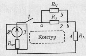 Рис. 1.3. Схема замещения электрической цепи Схема замещения электрической цепи состоит из совокупности различных идеализированных элементов, выбранных так, чтобы можно было с заданным или необходимым приближением описать процессы, происходящие в цепи. Конфигурация схемы замещения цепи характеризуется следующими геометрическими (топологическими) понятиями: ветвь, узел, контур. Ветвь схемы состоит из одного или нескольких последовательно соединённых элементов, каждый их которых имеет два вывода (начало и конец), причём к концу каждого предыдущего элемента присоединяется начало следующего. Узел схемы имеет три или большее число ветвей. Контур представляет собой замкнутую траекторию, состоящую из нескольких ветвей, причём ни одна ветвь и ни один узел не встречается в контуре более одного раза. Схема замещения (рис. 1.3) цепи, показанной на рис 1.1, содержит три ветви, причём две состоят из одного элемента каждая, а третья состоит из трёх элементов. На рис.1.3 указаны параметры входящих в цепь элементов: Rл – сопротивление лампы накаливания, RV – сопротивление вольтметра, RА – сопротивление амперметра, E – ЭДС аккумулятора и Rвт – внутреннее сопротивление аккумулятора. Три ветви соединены в узлах a и b. Если значения параметров всех элементов схемы замещения известны, то, пользуясь законами электротехники, можно рассчитать режим работы всех её элементов, т.е. определить электрическое состояние всех электротехнических устройств. Далее в тексте вместо термина схема замещения электрической цепи будут использоваться сокращённое название: схема цепи или схема.