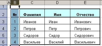 В примерах указана формула для выделения ячеек в верхней строки таблицы. Ссылки в формулах (смешанные) адаптированы для размножения формулы по столбцу (вниз). Фамилия начинается с буквы Л: = ЛЕВСИМВ($С3) = ”Л” Имя оканчивается на букву Н: = ПРАВСИМВ($D3) = ”н” Отчество оканчивается на “евич”: = ПРАВСИМВ($Е3;4) = ”евич” Имя содержит букву я: = ПОИСК(“я”;$D3; 1) > 0 Длина имени 10 символов: = ДЛСТР($D3) = 10 Длина фамилия менее 6 символов: = ДЛСТР($С3) < 6 Имя начинается с символов “АБВ”: = ПОИСК(ЛЕВСИМВ($D3); “АБВ”; 1) > 0 Имя и отчество начинается с одной буквы: = ЛЕВСИМВ($D3) = ЛЕВСИМВ($E3) Отчество начинается с гласной буквы: = ПОИСК(ЛЕВСИМВ($Е3); “аеёиоуыэюя”;1) > 0 Самое короткое отчество. Для этого используем дополнительный столбец F, в котором при помощи функции ДЛСТР записываем длину отчества, хранящегося в столбце D: = ДЛСТР($D3), а затем для ячейки D3 записываем формулув окне условного форматирования: = $F3=МИН($F$4:$F$6)