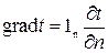 Рис. 1 – Изотермы температурного поля Так как одна и та же точка не может одновременно иметь различные температуры, то изотермические поверхности не пересекаются. Они либо оканчиваются на поверхности тела, либо целиком располагаются внутри самого тела. Температура в теле изменяется только в направлениях, пересекающих изотермические поверхности. При этом наибольшей перепад температуры на единицу длины происходит в направлении нормали к изотермической поверхности. Возрастание температуры в направлении к изотермической поверхности характеризуется градиентом температуры. Температурный градиент – это вектор с положительным знаком при возрастании температуры и с отрицательным при ее падении. Градиент температуры численно равен производной температуры по нормали, т. е.: