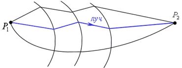 Луч, соединяющий две точки, идет по такому пути, который требует наименьшего времени (по самому быстрому пути).