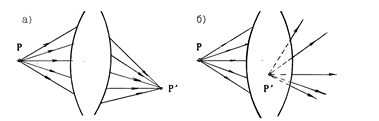 Если пучок световых лучей, идущий из какой-либо точки Р (рис. 4.7), после прохождения через оптическую систему пересекается в точке Р', то точка Р' называется изображением точки Р. Рис. 4.7. Изображение точки в оптической системе: а - действительное, б - мнимое.