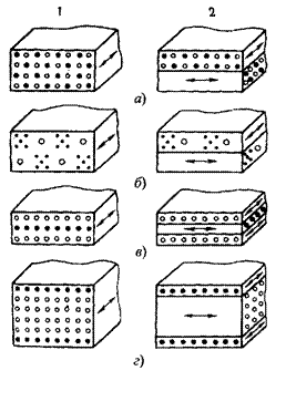 Рис. 5. Схемы армирования КМ: 1 - одномерного; 2 – двумерного 2) металлическая проволока из высокопрочной стали, вольфрама, молибдена и других металлов имеет меньшую прочность, чем нитевидные кристаллы. Однако ее выпускают промышленно в больших количествах и в связи с более низкой стоимостью широко применяют в качестве арматуры, особенно для КМ на металлической основе. 3) неорганические и поликристаллические волокна имеют малую плотность, высокую прочность и химическую стойкость. Широко применяют углеродные, борные, стеклянные и другие волокна для армирования пластмасс и металлов. Основное назначение наполнителей - придание КМ специальных свойств. Например, волокнистые наполнители вводят с целью получения максимальных прочностных характеристик. 3.По способу получения композиции и изделий из них полимерные и резиновые КМ разделяют на литейные и прессованные. Металлические КМ аналогично делят на литейные и деформируемые. Литейные получают путем пропитки арматуры расплавленным матричным материалом (сплавом). Для получения деформируемых МКМ применяют спекание, прессование, штамповку, ковку на молотах и др. по назначению. 4. По назначению КМ разделяют на общеконструкционные, термостойкие, пористые, фрикционные и антифрикционные и т.д.