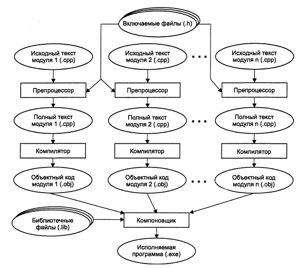 Сначала программа передается препроцессору, который выполняет директивы, содержащиеся в ее тексте (например, включение в текст так называемых заголовочных файлов - текстовых файлов, в которых содержатся описания используемых в программе элементов). Получившийся полный текст программы поступает на вход компилятора, который выделяет лексемы, а затем на основе грамматики языка распознает выражения и операторы, построенные из этих лексем. При этом компилятор выявляет синтаксические ошибки и в случае их отсутствия строит объектный модуль. Компоновщик, или редактор связей, формирует исполняемый модуль программы, подключая к объектному модулю другие объектные модули, в том числе содержащие функции библиотек, обращение к которым содержится в любой программе (например, для осуществления вывода на экран). Если программа состоит из нескольких исходных файлов, они компилируются по отдельности и объединяются на этапе компоновки. Исполняемый модуль имеет расширение.ехе и запускается на выполнение обычным образом. Определения и описания программы на языке С++ могут размещаться в строках текстового файла достаточно произвольно (в свободном формате.) Для препроцессорных директив существуют ограничения. Во-первых, препроцессорная директива обычно размещается в одной строке, т.е. признаком ее окончания является признак конца строки текста программы. Во-вторых, символ '#', вводящий каждую директиву препроцессора, должен быть первым отличным от пробела символом в строке с препроцессорной директивой. Задача препроцессора - преобразование текста программы до ее компиляции. Правила препроцессорной обработки определяет программист с помощью директив препроцессора. Каждая препроцессорная директива начинается с символа '#'. Препроцессор "сканирует" исходный текст программы в поиске строк, начинающихся с символа '#'. Такие строки воспринимаются препроцессором как команды (директивы), которые определяют действия по преобразованию текста. #define указывает правила замены в тексте. Директива #include определяет, какие текстовые файлы нужно включить в этом месте текста программы. Директива #include <...> предназначена для включения в текст программы текста файла из каталога "заголовочных файлов", поставляемых вместе со стандартными библиотеками компилятора. Каждая библиотечная функция, определенная стандартом языка Си, имеет соответствующее описание (прототип библиотечной функции плюс определения типов, переменных, макроопределений и констант) в одном из заголовочных файлов. Список заголовочных файлов для стандартных библиотек определен стандартом языка. Важно понимать, что употребление в программе препроцессорной директивы #include < имя заголовочного файла > не подключает к программе соответствующую стандартную библиотеку. Препроцессорная обработка выполняется на уровне исходного текста программы. Директива #include только позволяет вставить в текст программы описания из указанного заголовочного файла. Подключение к программе кодов библиотечных функций осуществляется только на этапе редактирования связей (этап компоновки), т.е. после компиляции, когда уже получен машинный код программы. Доступ к кодам библиотечных функций нужен только на этапе компоновки. Именно поэтому компилировать программу и устранять синтаксические ошибки в ее текст