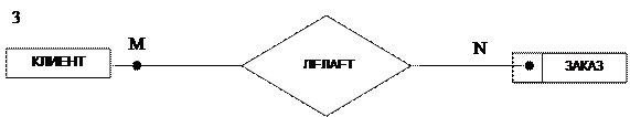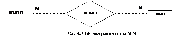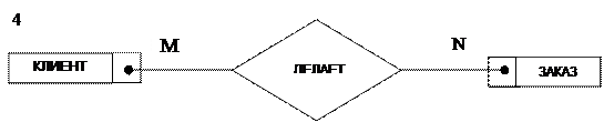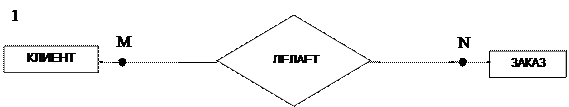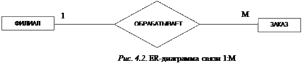 Так как филиал обрабатывает несколько заказов, а заказ обрабатывается только одним филиалом, то каждый экземпляр сущности ФИЛИАЛ может быть связан более чем с одним экземпляром сущности ЗАКАЗ, а каждый экземпляр сущности ЗАКАЗ может быть связан не более чем с одним экземпляром сущности В этом случае связь 2 имеет тип «один-ко-многим» (1:М). На рис. 4.2 представлена ER-диаграмма для связи типа 1:М. Так как заказ могут делать несколько клиентов и клиент может иметь несколько заказов, то каждый экземпляр сущности ЗАКАЗ может быть связан с несколькими экземплярами сущности КЛИЕНТ и каждый экземпляр сущности КЛИЕНТ может быть связан с несколькими экземплярами сущности ЗАКАЗ. В этом случае связь 3 имеет тип «многие-ко-многим» (М:N). На рис. 4.3 представлена ER-диаграмма для связи типа М:N.