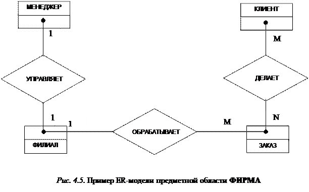 На ER-диаграмме 1 класс принадлежности обеих сущностей необязательный. На ER-диаграмме 2 класс принадлежности сущности КЛИЕНТ обязательный, а сущности ЗАКАЗ необязательный. На ER-диаграмме 3 класс принадлежности сущности КЛИЕНТ необязательный, а сущности ЗАКАЗ обязательный. На ER-диаграмме 4 класс принадлежности обеих сущностей обязательный. Предположим, что в рассматриваемой предметной области ФИРМА класс принадлежности всех четырех сущностей является обязательным. Тогда ER-модель предметной области ФИРМА будет иметь вид, представленный на рис. 4.5.