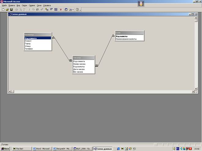 Создание связей между таблицами. Связи между таблицами создаются в окне Схемы данных в меню Сервис. В окно схемы данных по очереди добавляются все необходимые и заранее созданные таблицы. Для создания связей ключевое поле одной таблицы с помощью мыши перемещается на соответствующее поле другой таблицы.