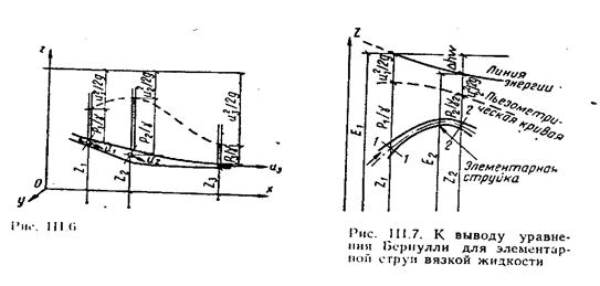 Все эти величины имеют линейную размерность, следовательно, их сумма, обозначаемая через Н, имеет также размерность длины. Величину Н называют полным напором в данном сечении струйки. Для каждого поперечного сечения элементарной струйки величина Н может быть представлена совокупностью отрезков z, Соединив между собой концы отрезков Н, получим кривую, расположенную в горизонтальной плоскости; эту плоскость и кривую на ней называют плоскостью и линией полного напора. Соединив кривой концы отрезков Итак, рис. III.6 дает геометрическое истолкование уравнения Бернулли. Можно видеть, как по длине струйки меняются слагаемые этого уравнения. Если сечение расширяется и, следовательно, скорость уменьшается, то уменьшается скоростной напор, но возрастает сумма Если рассматривать уравнение Бернулли как уравнение энергии, то каждое слагаемое этого уравнения надо расценивать как некоторую составляющую полной энергии (потенциальную или кинетическую), и каждое из этих слагаемых должно измеряться в единицах работы. Уравнение (III.13) представлено в линейных единицах, поэтому, чтобы перевести его в уравнение работы, надо помножить его на единицу силы; если помножить его, например, на 1Н, то уравнение не изменится, но размерность каждого слагаемого будет выражена в Н Аналогично Величина Пьезометрическая линия отделяет область изменения потенциальной энергии от области изменения кинетической энергии. Легко видеть, что с энергетической точки зрения уравнение Бернулли показывает, что сумма потенциальной энергии (положения и давления) и кинетической энергии есть величина постоянная, т.е. одинаковая по пути данной элементарной струйки невязкой жидкости. Полная удельная энергия остается неизменной. Таким образом, уравнение Бернулли представляет собой закон сохранения механической энергии при движении идеальной жидкости. Уравнение Бернулли для элементарной струйки вязкой жидкости. Вязкая жидкость испытывает сопротивление при движении, и ее удельная энергия не может сохраняться неизменной вдоль струйки. В соответствии с этим при движении вязкой жидкости в уравнение Бернулли надо ввести поправку на потери напора при переходе от некоторого сечения струйки к сечению, расположенному ниже по течению. Обозначая потери напора через
