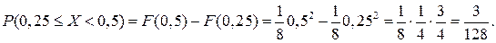 5) Функция распределения непрерывной случайной величины X задана выражением: Найти вероятность попадания величины X в диапазон от 0,25 до 0,5. Решение: Границы интервала (0,25; 0,5) принадлежат к функции распределения, заданной средней строкой. Вероятность попадания случайной величины в этот интервал: